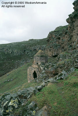“Почти у самой вершины плато прилепился армянский монастырь. По горной извилистой тропинке проехал туда. Маленький храм из темного массивного камня, многовековой. Есть несколько тенистых деревьев, дававших уют. Бьет маленький родничок. Сверху замечательный вид на ущелье, долину. Было уютно и тихо. Выцветший от древности, подслеповатый старичок схимник растерянно смотрит на меня, не зная, видимо, за кого меня принять - за врага иль друга? Костюм ведь “азиятский”! Чтобы рассеять его сомнения, я снял папаху и перекрестился, глядя на его монастырь, и дал ему рубль серебром. Он его принял как совершенно непонятную и ненужную ему вещь, с полным безразличием. “Суета сует...” - думаю я. Ему, наверное, дороже всего на свете был покой здесь, в этом храме-гнезде, а остальное... зачем оно ему? И даже русский царский рубль, хотя бы и серебряный...” Это описание дано в начале мая 1915 года, через три месяца автор опять будет в этих местах, но об этом ниже...